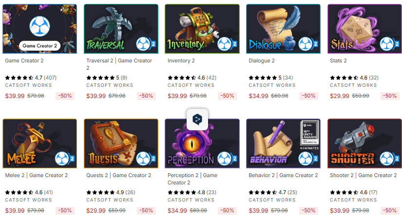 現在UnityAssetStoreではパワフルなゲーム制作ツールであるGame Createrシリーズを中心に販売している「Catsoft Works」のアセットが50%になるパブリッシャー丸ごとセールが開催されています。
