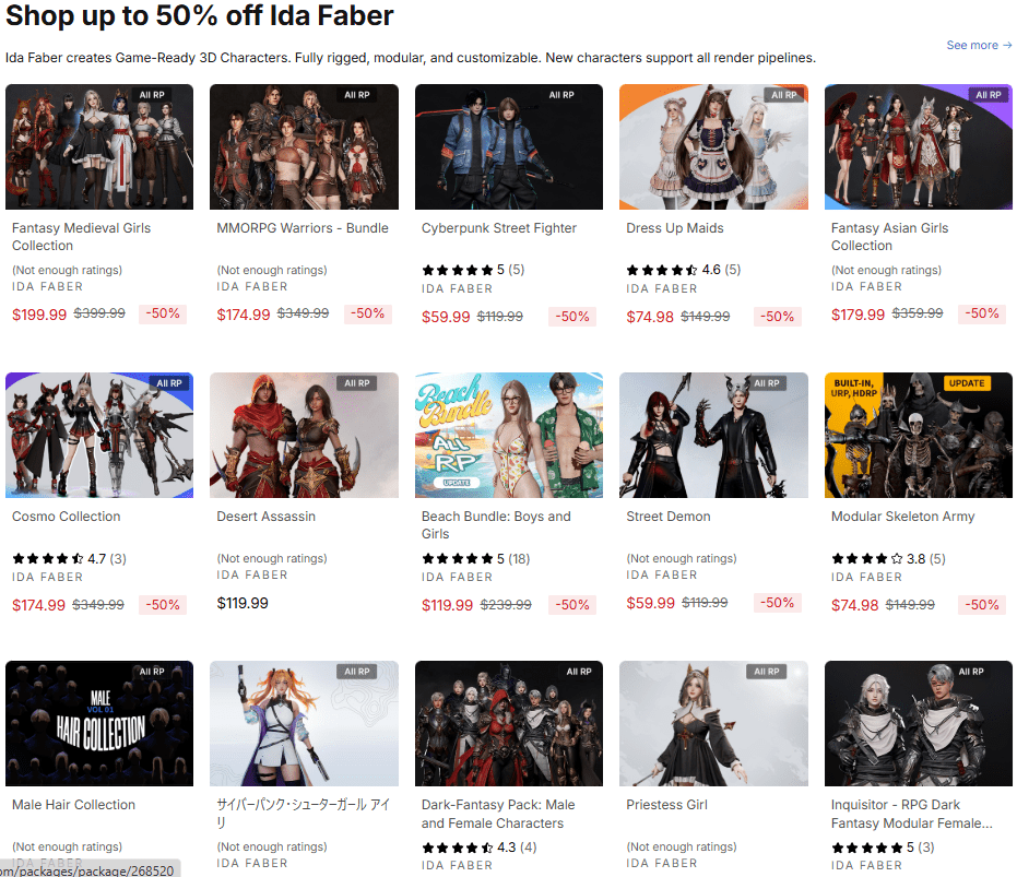 現在UnityAssetStoreでは手書き風の男女3Dモデルなどを中心に販売している「Ida Faber」のアセットが50%になるパブリッシャー丸ごとセールが開催されています。