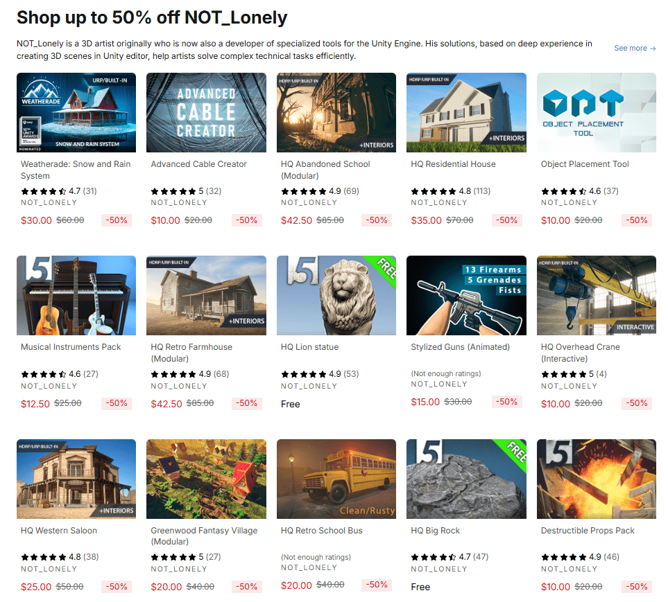 現在UnityAssetStoreではテーマごとの環境3Dモデルなどを中心に販売している「NOT_Lonely」のアセットが50%になるパブリッシャー丸ごとセールが開催されています。
