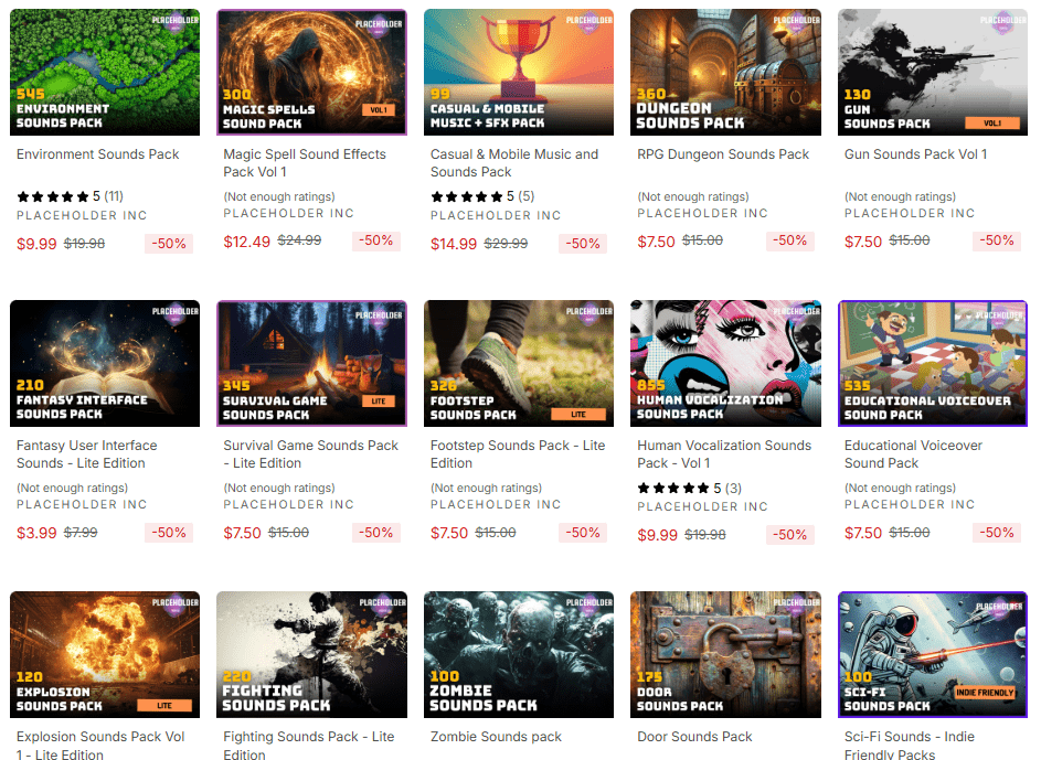 現在UnityAssetStoreではテーマごとの効果音集などを中心に販売している「PlaceHolder Inc」のアセットが50%になるパブリッシャー丸ごとセールが開催されています。
