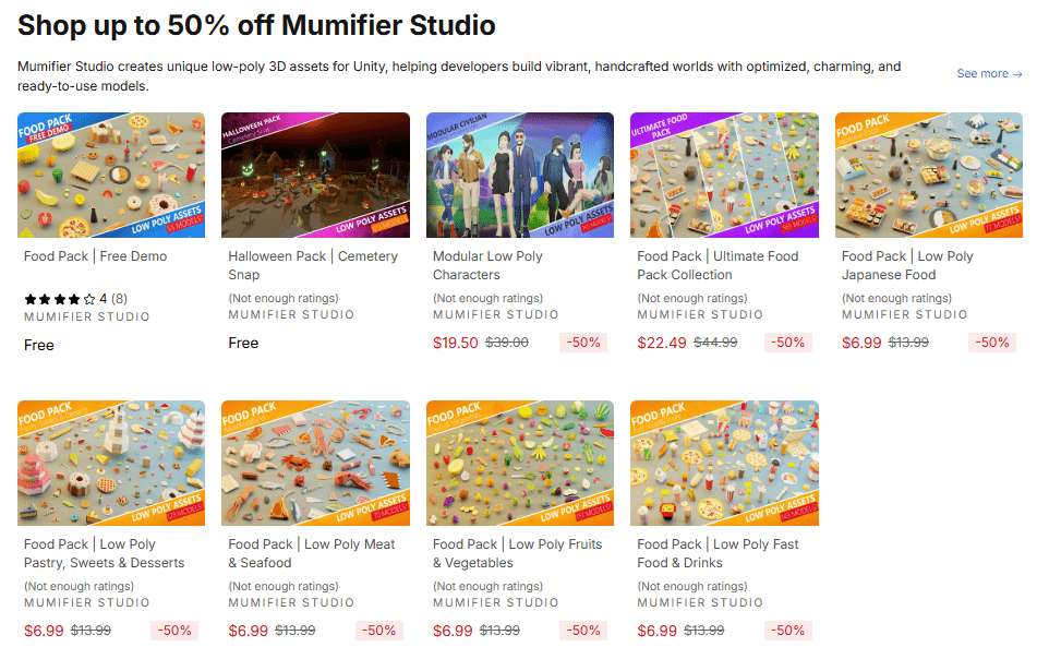 「Mumifier Studio」さんのアセットの特徴はテーマごとに用意されたローポリゴンの3Dモデル集が印象的です。