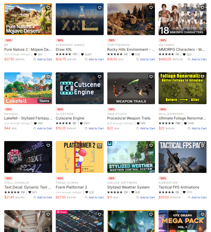新しいものの中で人気アセットを中心に、約250種を超える魅力的なアセットが50%オフのセール対象