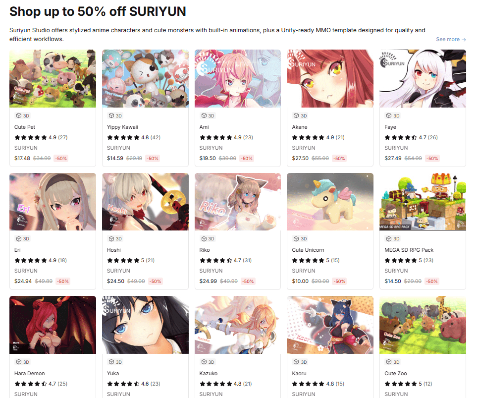 現在UnityAssetStoreではかわいい3Dモデル集やRPGテンプレートなどを中心に販売している「SURIYUN」のアセットが50%になるパブリッシャー丸ごとセールが開催されています。