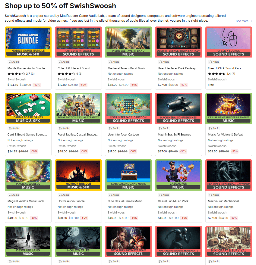 現在UnityAssetStoreではテーマごとの効果音集などを中心に販売している「SwishSwoosh」のアセットが50%になるパブリッシャー丸ごとセールが開催されています。
