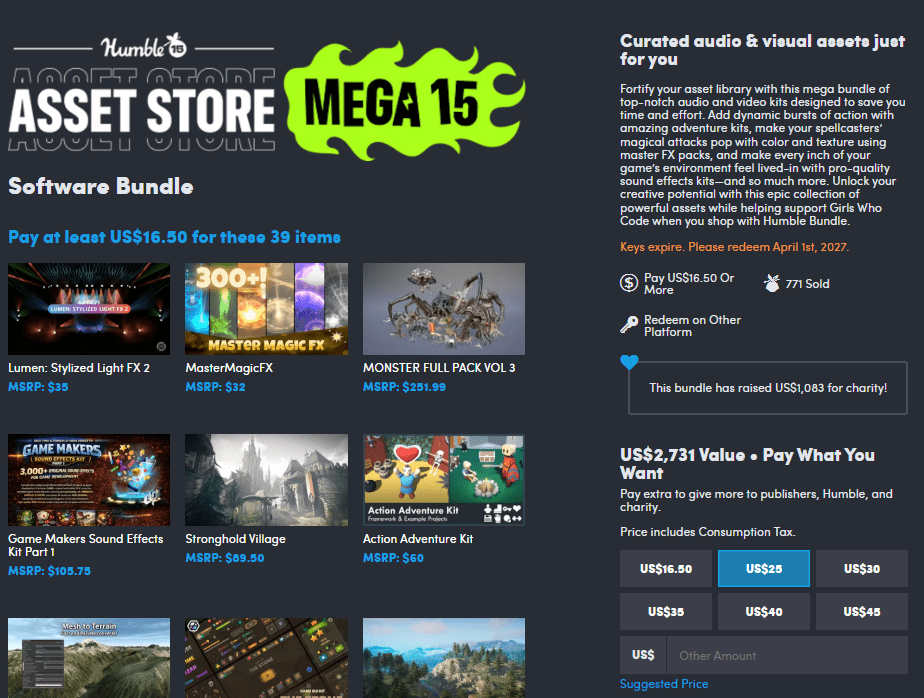 今回は$16.50以上で39個のアセット(US $2,731相当)を格安で購入することができます。(冗談抜きでお得すぎ)